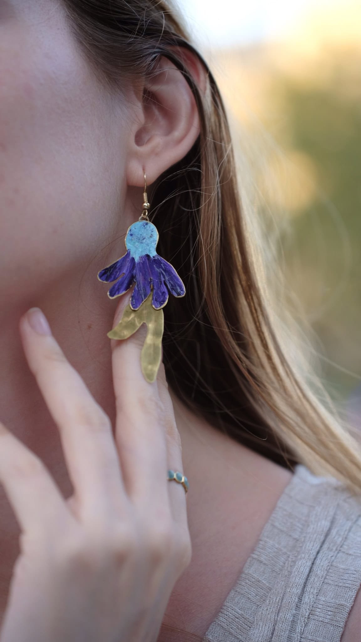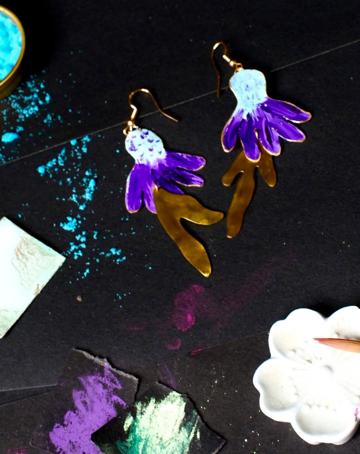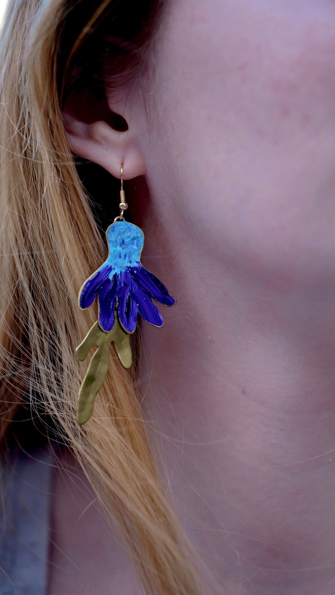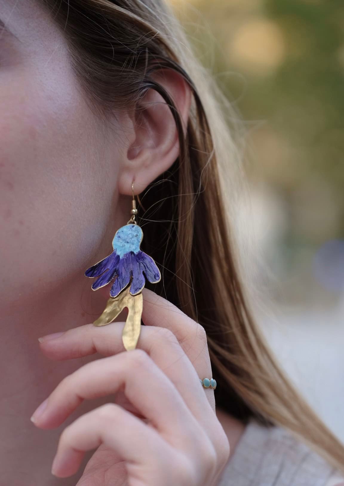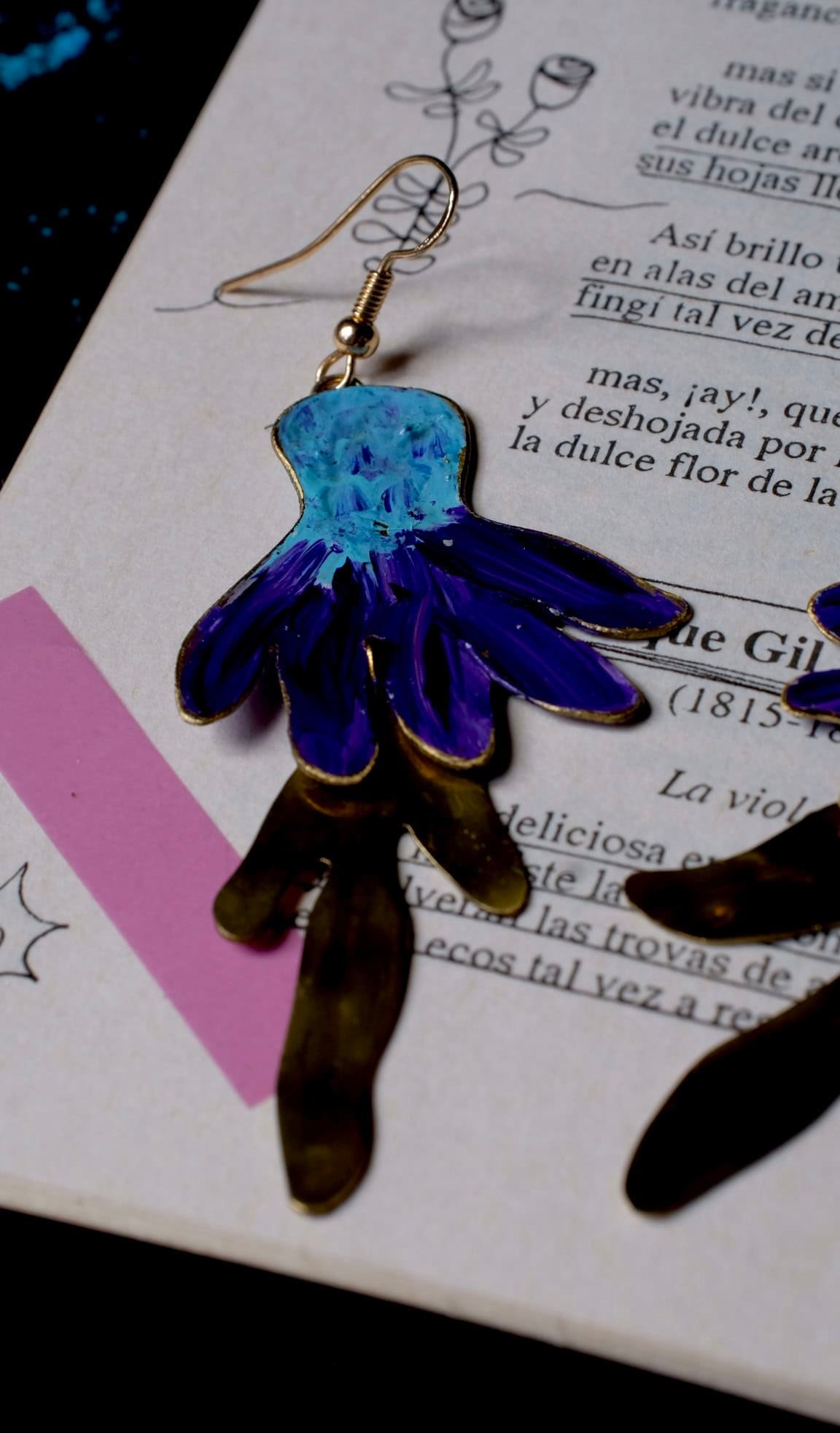 - Handmade flower earrings painted by hand with soft strokes of artistic pigments. Material copper, gold-plated.