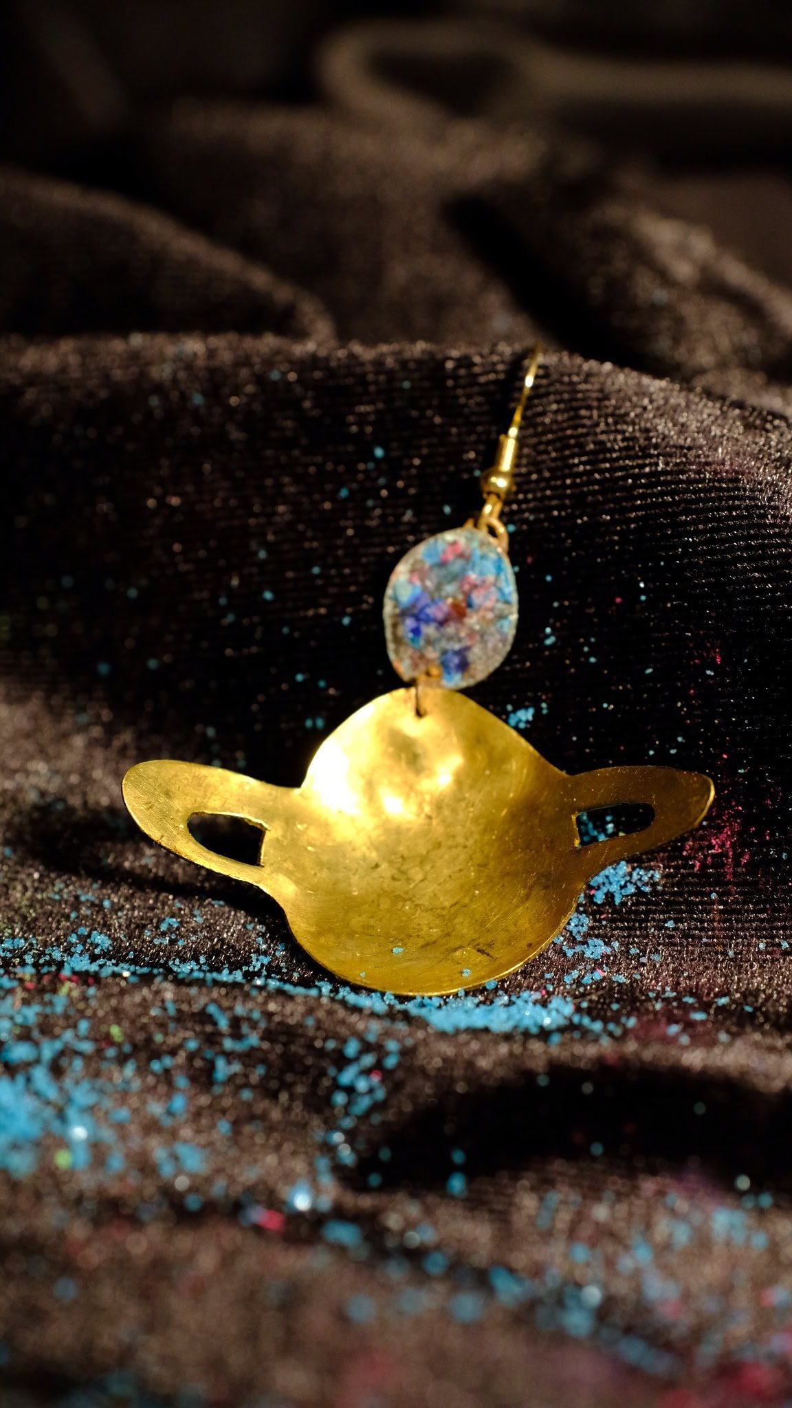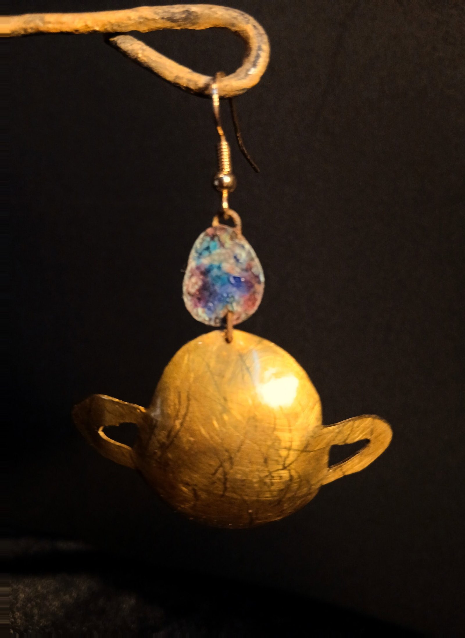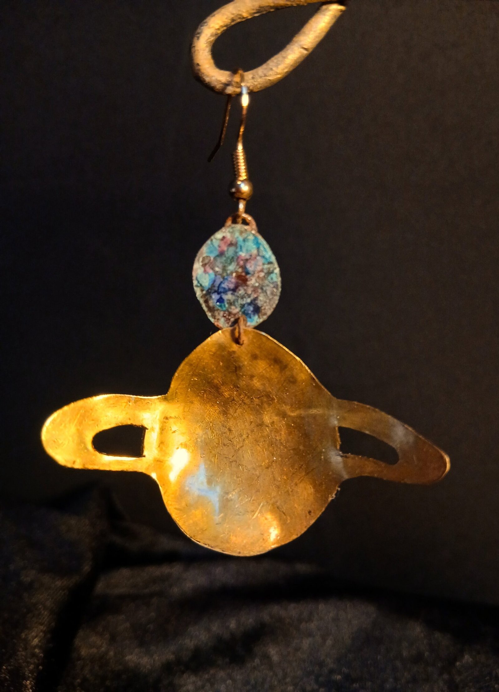 • Handmade earrings painted by hand and patinated under the natural light of the sun with soft strokes of artistic pigments. Material copper with gold-plated forms of the planet Saturn.