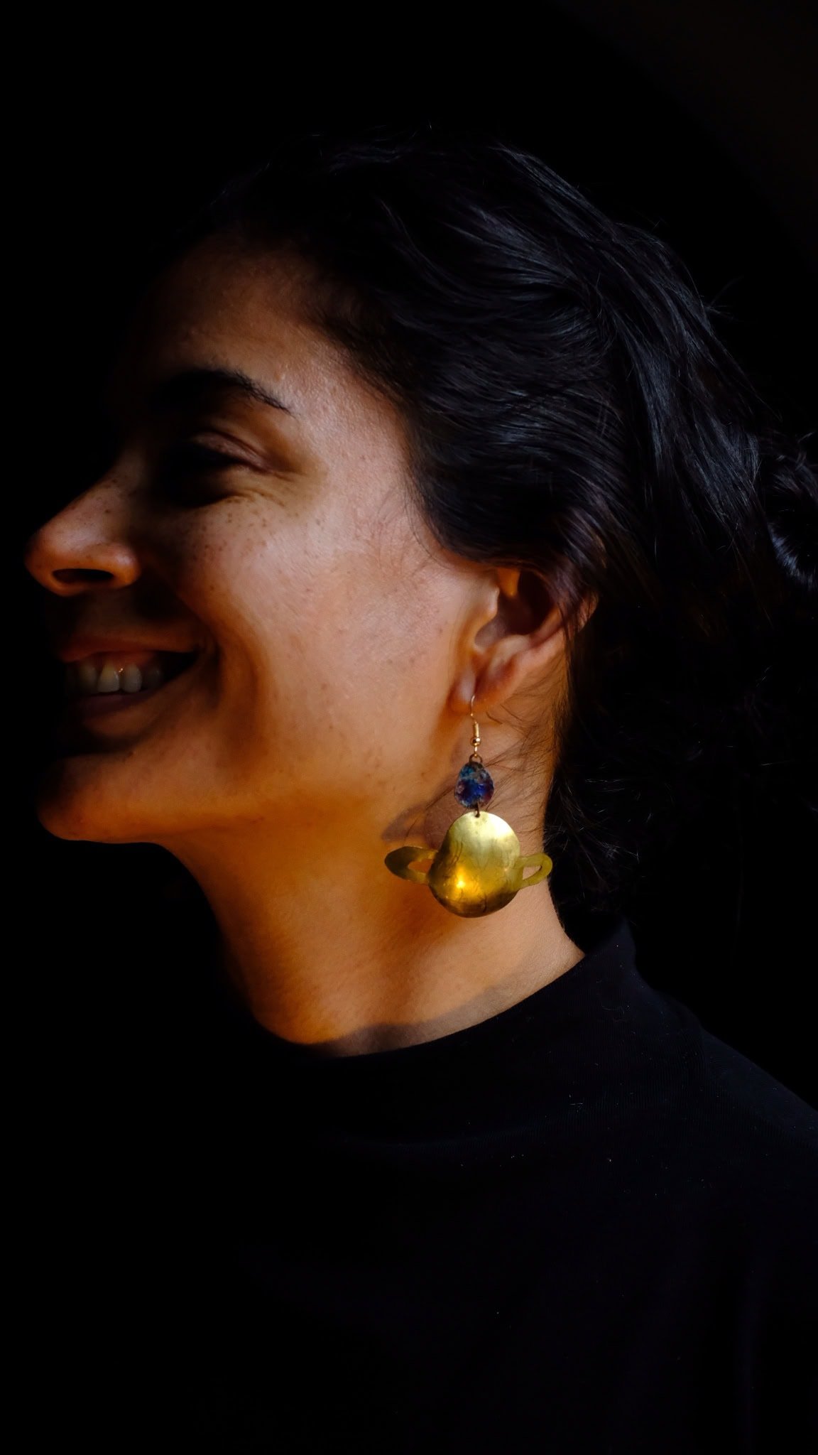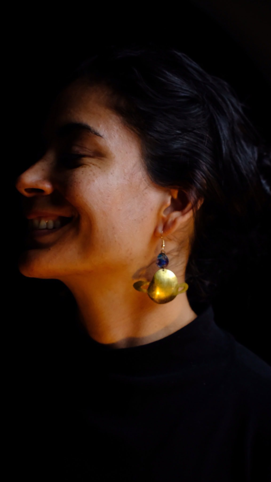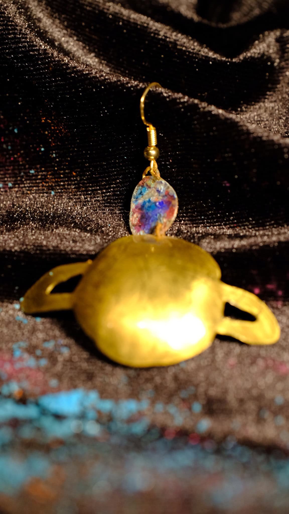 • Handmade earrings painted by hand and patinated under the natural light of the sun with soft strokes of artistic pigments. Material copper with gold-plated forms of the planet Saturn.